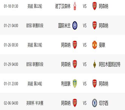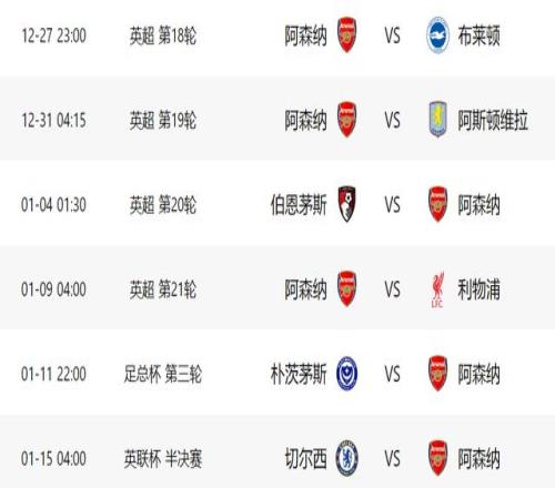 在足总杯第3轮比赛中,阿森纳将做客对阵朴茨茅斯,由于2队实力差距明显,阿森纳哪怕用替补,都有很大机会过关。之后就是联赛杯半决赛首回合比赛,阿森纳先踢客场,对手是同城死敌切尔西,如果能够在客场全身而退,阿森纳就有很大机会晋级决赛了。2场杯赛之后,阿森纳就要在联赛中客场对阵诺丁汉森林,好在对手本赛季状态低迷,阿森纳应该有把握拿到3分。在1月下旬,欧冠重新开战,阿森纳将做客对阵国米,如果能战胜对手,阿森纳就将提前锁定小组前二。之后的联赛,阿森纳要在主场迎战曼联。欧冠小组赛收官战,阿森纳将在主场对阵弱旅阿拉木图凯拉特,随后2场比赛,阿森纳的对手分别是利兹联和切尔西(联赛杯半决赛第二回合)。