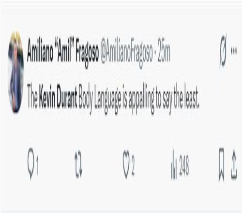 也有火箭球迷认为杜兰特的肢体语言太沮丧了。(第三节打了10分钟只有2个出手战意全无)